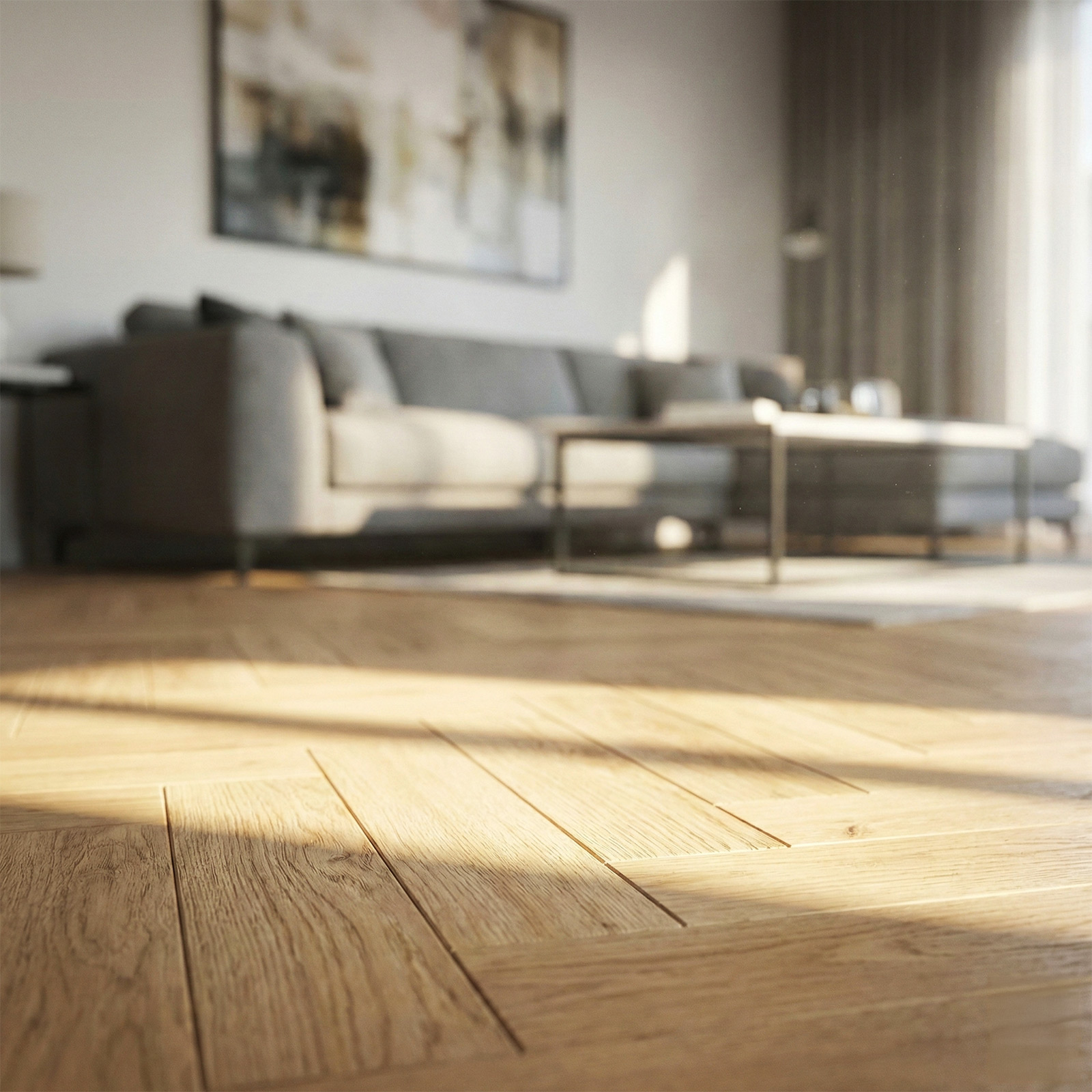 Eine architektonische Aufnahme eines modernen, lichtdurchfluteten Wohnraums. Der Fokus liegt auf einem perfekt verlegten Eichen-Fischgrätboden.